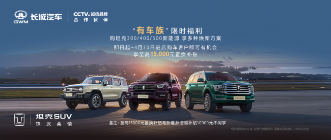 具体方面,4月1日起至4月30日,无论是本品牌还是外品牌增购用户,购买坦克300 Hi4-T、坦克400 Hi4-T/Z、坦克 500 Hi4-T/Z新能源车型,均可享受 10000元的增购补贴。